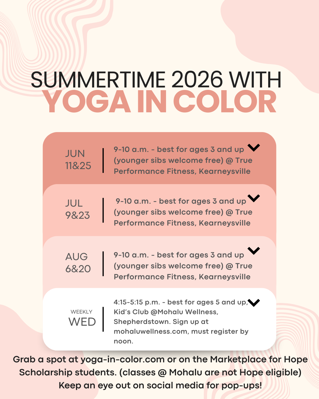 **After purchasing, please email yogaincolorllc@gmail.com with the name and age of your child and the date(s) attending. One ticket = one class.